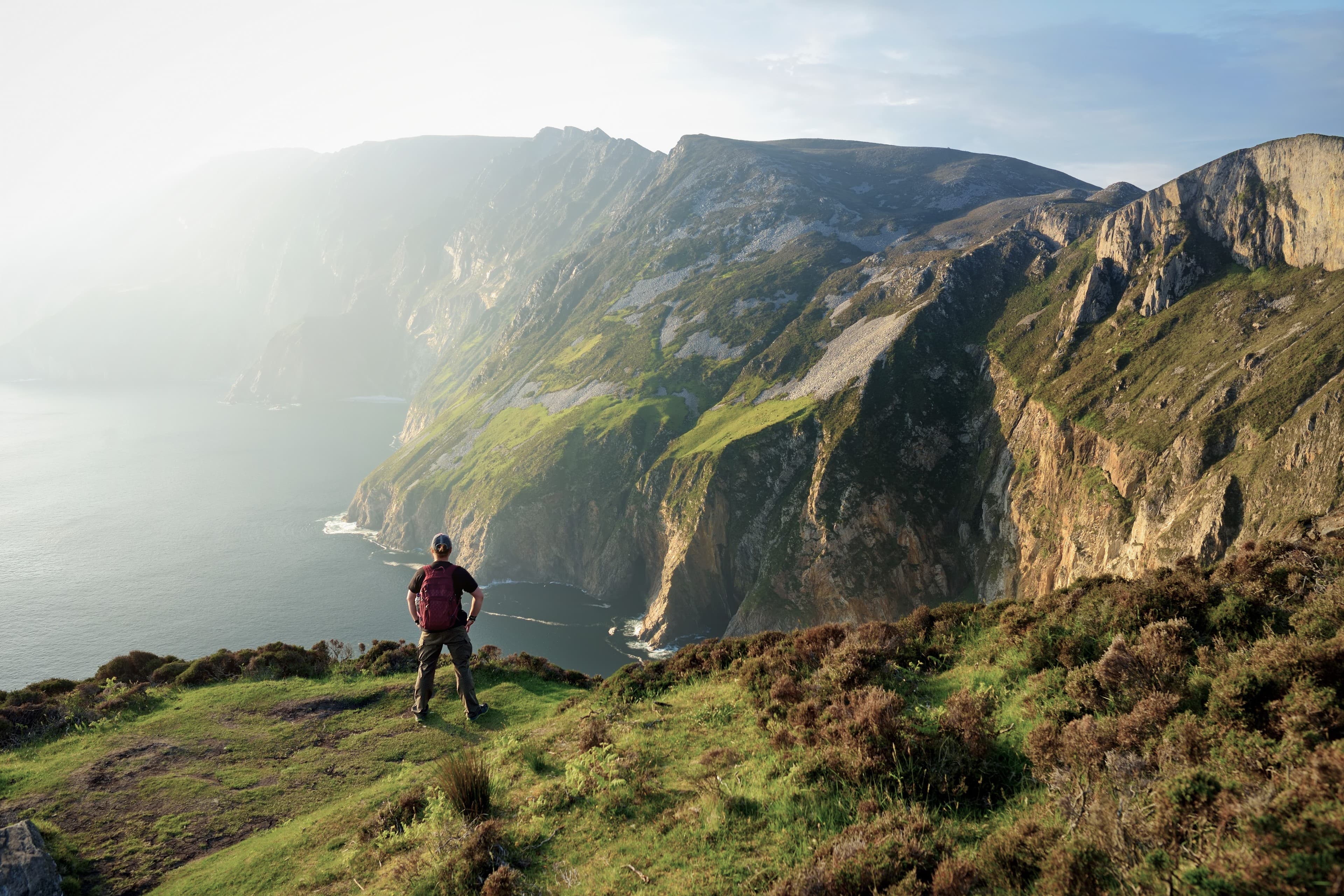 Je weiter nördlich du fährst, desto mehr gehört Irland dir allein. Westport ist der letzte vertraute Punkt. Eine einzige Brücke trennt dich von Achill Island – dahinter beginnt eine andere Welt: schwarze Klippen, verlassene Dörfer, Strände in einem Türkis, das hier niemand erwartet. Sligo liegt zwischen Bergkuppen und Atlantik, rau und still. In Donegal wird die Landschaft zur Hauptsache. Die Slieve League Klippen fallen 600 Meter senkrecht ins Meer – dreimal so hoch wie die Cliffs of Moher. Tief im Landesinneren wartet der Glenveagh Nationalpark: Rotwild im Hochmoor, uralter Eichenwald und ein Schloss am Seeufer, das aus der Zeit gefallen scheint.